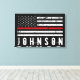 Eine Wand-Leinwand in Not mit einer dünnen roten Linie amerikanischen Flagge als Hinweis für Feuerwehrleute. Darunter befindet sich ein Ort für Ihren oder Ihren Geschenksempfangsnamen. Bitte befolgen Sie diese Anweisungen, um sicherzustellen, dass Ihr Name unter der Flagge perfekt ist. 1. Geben Sie zuerst einen Namen ein, entweder zuerst oder zuletzt im Text-Bar. 2. Klicken Sie auf die Schaltfläche Anpassen und finden Sie Ihren Namen unter den Ebenen. 3. Ändern Sie die Größe des Schriftartes und den Abstand der Buchstaben "AV", sodass Ihr Name perfekt unter die Fahne passt.