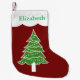 Kutschiges Weihnachtsbaumdesign mit weißgestrichener Gartenlandschaft und roten Punktverzierungen auf rotem Hintergrund. Die Oberseite des Strumpfs ist mit einem weißen, geschossenen Oberteil versehen, in dem Sie Ihren personalisierten Namen in Grün auswählen können.