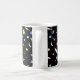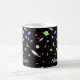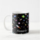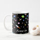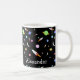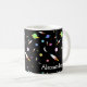 Eine Tasse mit Raketen, Sternen, Monden und bunten Planeten. Personalisieren Sie sich mit dem Namen Ihrer Wahl. Gut für zukünftige Astronauten.