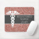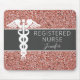 Fügen Sie Ihrem Zuhause-Büroschreibtisch mit diesem Personalisiert registrierten Nurse Rose Gold Glitzer Mouse Pad etwas Glam hinzu. Dieses moderne Design besticht durch das trendige, rosafarbene Imitat mit Glitzer und ein weißes Medizinikadueus-Symbol in der links Mitte. Angepasst mit "Registered Nurse" in minimaler, dünner Schrift, gefolgt vom Namen in der weißen Schrift, handgeschriebener Schriftart in der rechten Mitte.
