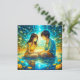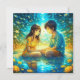Personalisiertes Anime-Girl und Junge auf einer romantischen Abendkarte am Valentinstag. Hübsche Blau- und Golddetails und Wasserspiegelung.