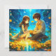 Personalisiertes Anime-Girl und Junge auf einer romantischen Abendkarte am Valentinstag. Hübsche blaue und goldene Blume und Wasserspiegelung.