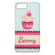 Rufen Sie Fall mit rosa kleinem Kuchen und Kirsche auf tadellosem blauem gestreiftem Hintergrund an.