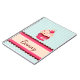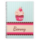 Notizbuch mit rosa kleinem Kuchen und Kirsche auf tadellosem blauem gestreiftem Hintergrund.