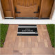 Dockmat mit dem Namen der Boote. Weiße Streifen. Schwarzer Hintergrund.