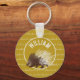 Schaffen Sie ein lustiges kleines Geschenk oder Gastgeschenk, das perfekt für Tierliebhaber ist. Dieser personalisierte Schlüsselanhänger zeigt und illustriert ein braunes Porcupine vor einem senfarbigen goldfarbenen Hintergrund mit Ihrem Namen in bedrücktem Stil weißen Schriften.