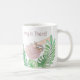 Diese niedliche Tasse ist mit einer Aquarellfarbe eines lächelnden Hangs geschmückt, der von einem Zweig mit tropischen Blätter und den Worten Hang In There hängt!