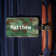 Personalisierte Gepäckmarke in grüner Camouflage hat einen fett weißen Namen auf der Vorderseite und den Namen, die Adresse und die Telefonnummer der Person auf der Rückseite. Das Tarnmuster ist reich an lebendigem Grün mit braunen und grauen Streifen.