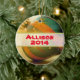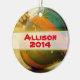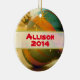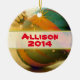 Personalisieren Sie mit Ihrem eigenen Text. Ein Foto eines hellen und glänzenden Teardrop-förmigen Urlaubsornaments zur Dekoration Ihres Weihnachtsbaumes. Dieser festliche Ball ist wie ein Heißluftballon geformt. Farbenfarben ein saisonales Grün mit fröhlichen, blassorangen Streifen umgeben von goldenen Sternen und Kreisen.