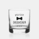 Maßgeschneidertes Hochzeitsbegleiter Whiskey Glas mit dem Titel "TRAUZEUGE", eine Bogen-Krawatte, das Datum und ihren Namen.