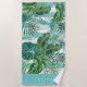 Mit diesem coolen botanisch gedruckten Strandtuch in Strandtönen in Grün, Türkis und Weiß können Sie Ihren Strand oder Ihren Pool mit tropischem Flair aufwarten. Das Design zeichnet sich durch grüne Bananen-Blätter, Monstera und Palmenfronten aus, die auf Aqua- und Weißstreifen überlagert sind. Personalisieren Sie Ihre Daten mit einem individuellen Namen, Familiennamen oder Monogramm unten in klassischer weißer Schrift.