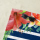 Dieses personalisierte Strandtuch ist mit einem blau-weiß gestreiften nautischen Strandtuch mit tropischen Blume ausgestattet. Personalisieren Sie es mit einem Namen.