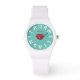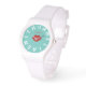 Personalisiertes modernes, helles, aquamarines, weißes und rotes Armbanduhr-Design mit Vor- und Nachname des Besitzers. Die Buchstaben befinden sich statt der Zahlen auf dem Rad. Die Uhr sagt Amelia Smith. In der Mitte des Zifferblattes sind rote Lippen für Akzent Farbe, darüber der rote Name Amelia. Sie können die Hintergrundfarbe, die Buchstabenfarbe, den Schriftart ändern, Ihren Vor- und Nachnamen schreiben, indem Sie auf den Button "Personalisieren" klicken und dann auf die Inschrift "Klicken Sie, um weiter anzupassen". Wenn Sie Ihren Vor- und Nachnamen nicht selbst schreiben können, kontaktieren Sie mich bitte in einer persönlichen Nachricht.