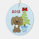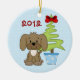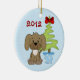 Dieses Baby's First Christmas Ornament verfügt über einen niedlichen braunen Welpenhund, neben einem Weihnachtsbaum sitzend, mit einem blauen mit weißen Polka Punkte Hintergrund. Es kann mit einem Namen, einem Jahr oder einem beliebigen Text personalisiert werden, den Sie hinzufügen möchten. *