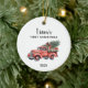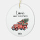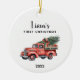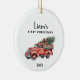 Personalisieren Sie Ihren Weihnachtsbaum mit dem ersten Weihnachtsschmuck dieses hübschen Babys. Ein lustiges Weihnachtsdesign mit einem Weihnachtsbaum, der in einen klassischen Lieferwagen-LKW geladen ist. Personalisieren Sie Ihre persönlichen Daten mit dem Vornamen und dem Jahr des Babys.