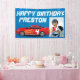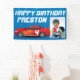 Fügen Sie Ihr Foto der kleinen Jungen dieser fantastischen Rennenauto-Geburtstagsfahne hinzu! Kennzeichnet ein super cooles Rot - frisiertes Auto mit Flammen auf den Seiten- und schwarzen Rädern. Heller blauer Hintergrund und der Name und das Foto Ihres Sohns! Eine große Überraschung für eine Kinderautolaufenthemageburtstags-Partydekoration.