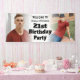 Modernes 21. Geburtstag Party Willkommensschild für Männer. Personalisiertes Banner mit moderner 2-Foto-Collage und fett formatierten Briefen. Für den Innen- oder Außengebrauch. Um die Platzierung des Fotos zu ändern: Klicken Sie auf die Schaltfläche, um das Design anzupassen, klicken Sie auf "Zuschneiden" und verschieben Sie das Bild, um es zu zentrieren.