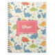 Dieses personalisiert spielerische Notizbuch enthält farbenfrohe, whimsical Dinosaurier, die in lustigen Posen lächeln. Im Mittelpunkt des Designs steht ein handgezeichnet Namensschild.
