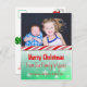 Fügen Sie einfach Ihre Kinder- oder Familienjunges Foto zu dieser niedlichen frohen Weihnachtspostkarte hinzu. Es ist eine süße und erschwingliche Art, Ihren Freunden und der Familie frohe Weihnachten zu sagen und sie mit einem Foto zu aktualisieren! Niedliche kleine Akzente auf der Rückseite der Postkarte wie ein grüner und roter Zuckerrohrstock, Schneeflocken und Weihnachtsgarten.