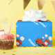 Personalisiertes Geburtstagsverpackungspapier | Rotes Spielzeug Choo Zug. Spielzeuglokomotive Cartoon Design mit individualisierbarem Kindernamen. Eisenbahn-Geschenkpackung für Junge oder Kleinkind. Blaue Hintergrundfarbe anpassbar. Niedliche Idee für 1. Geburtstag oder Baby Dusche Party. Kinderspielzeug-Grafik. Auch schön für Weihnachtsfeiertage.