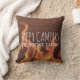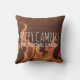 Perfektes personalisiertes rustikales Dekorgeschenk für rvers, Wanderer, Camper und outdoorsy Arten ist dieses rustikale Kissen des niedlichen Campingsthemas. Es liest glückliche Camper in handgeschriebenem, alle Hauptstadtsweißbuchstaben. Unter ist personalisierter Name der Familie oder jedes kundenspezifischen Textes, die Sie in den wunderlichen mögen, weißen Buchstaben. Gegen Lagerfeuerhintergrund einer Nahaufnahme eines brennenden Feuers und des Holzes. Niedliches Ruhestandsgeschenk, auch.