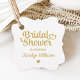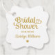 Elegante, kundenspezifische Hochzeitskartentafeln mit einem modernen Kalligraphieskript "Brautparty"-Typografie-Design mit niedlichem Herzakzent und dekorativer Kantenform. Personalisieren Sie mit dem Namen der Braut und ein persönliches Dankeschön für die gefeierte Nachricht auf der Rückseite. Sauberes und einfaches Design. Beachten Sie, dass das Farbschema Gold und Weiß geändert werden kann.