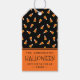 Das festliche Halloween-Party-Design zeichnet sich durch einen gelblich-orangefarbenen und gelben Silberkornprint auf schwarzem Hintergrund aus. Mit vier Textzeilen können Sie diese Tags individuell gestalten, um sie an Halloween-Party-Favoriten oder Leckerei-Taschen anzubringen.