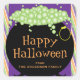 Dieser farbenfrohe Halloween-Aufkleber enthält einen schwarzen Hexenkopf mit grüner blubbernder Suppe. Hellgrüne, orangefarbene und lila Streifen prägen den Hintergrund. Orangefarbener Text auf dem schwarzen Pot lautet: Happy Halloween. Anpassbarer Text, in der Nähe des unteren, erlaubt es Ihnen, Ihren Namen hinzuzufügen.