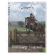 Dieses Notizbuch enthält ein originelles digitales Kunstwerk eines Pferdes und Reitens, das über ein Tor eines Bauernhofs springt und von dem Künstler Jayne Wilson in Vue erstellt wurde. Der Text auf der Vorderseite des Notebooks kann personalisiert sein.