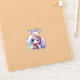 Niedlicher Mädchenname personalisierter Party-Aufkleber mit einem bezaubernden Cartoon Regenbogen Einhorn mit einem Geburtstagshut auf dem Besitz eines Geschenks mit einem Regenbogen im Hintergrund.