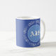 Eine Person initialisiert eine Tasse. Geben Sie Tasse mit Initialen. Attraktive Tasse mit einem kreisförmigen blüh, den Sie mit Initialen Ihrer Wahl personalisieren können. Blaues Farbthema.