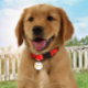 Zwei Seitenhundmarkierungen mit einer gelben Hundenträchtigung auf der Vorderseite und einem Monogramm in Serif-Schriftart. Auf der Rückseite befinden sich der Hundename und die Telefonnummer des Besitzers in einem serifenlosen Schriftart.