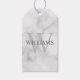 Die personalisierte Monogram und Name Gift Tag sind mit personalisierten Namen in Grau und Monogramm in hellgrau als Hintergrund, im klassischen Serif Schriftart Stil, auf weißem Marmor-Hintergrund. Ideal für Ferien, Wiedersehen und besondere Anlässe.