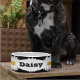 Keramik Haustierfutterschale für Ihre Katze oder Ihren Hund, die das Foto einer weißen Daisy-Blume mit gelber Mitte vor schwarzem Hintergrund zeigt und zusammen mit dem Namen Ihres Haustieres in einem sich wiederholenden Muster gedruckt wird. Personalisieren Sie Ihre Schüssel, indem Sie den Namen Ihres Haustieres durch den Namen Ihres Haustieres ersetzen. Passen Sie die Textgröße oder den Stil des Schriftartes an. Ein schönes, blumengeschmücktes Design! Wählen Sie Ihre Schüssel Größe.