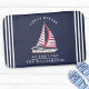 Erstellen Sie personalisierte Wasserbad-Accessoires für Ihr Seehaus. Das Life is Better am Lake Sprichwort ist mit einer Darstellung von Segelbooten mit roten und weißen Segel und weißen Streifen auf einem marineblauen Hintergrund dekoriert. Template macht es einfach, diese nautische Badematte mit Ihrem Namen oder Familiennamen zu personalisieren.
