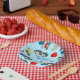 Frische und farbenfrohe Kindergeburtstag Party Papierschüsseln mit einem niedlichen Kinderspielmuster inklusive Ente, Auto, Flugzeug, gestopftes Tier Hase und Ballon auf strukturiertem hellblauen Hintergrund. Personalisiert mit Kindernamen.