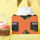 Schwarz-Gold-Graduierungskappe auf orangefarbenem Hintergrund. Bearbeiten Sie Text, um den Namen und das Jahr des Abschlusses hinzuzufügen.