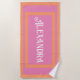 Cooles Badetuch in sonnigen Sommerfarben. Heiß rosa Hintergrund mit lebhaften orangefarbenen Rechtecken mit Platz für Ihren Namen oder Ihre Monogramm. Gut für ein Geschenk!