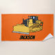 Ein Handtuch für zukünftige Bauarbeiter, es zeigt eine gelbe Bulldozer vor einem orangefarbenen Hintergrund wie die Farbe der Bauzeichen. Personalisieren Sie sich mit dem Namen Ihrer Wahl. Der Hintergrund kann in die Farbe Ihrer Wahl geändert werden.
