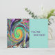 Kundengebundene abstrakte Turbulenzstrudelentwurfs-Party Einladungen oder -mitteilungen. Auf der links Seite ist ein funky abstrakter Entwurf in den Losen hellen, Neonfarben, einschließlich Orangen, Golde, Blues, Grüntöne, Purpur und Rosa. Der Entwurf sieht wie eine gewundene Turbulenz gegen einen hellen Mehrfarbenhintergrund aus. Die links Hälfte ist, wenn sie hellblauen Hintergrund mit dem Zusammenbringen der lila Buchstaben zusammenbringt. Funky retro psychedelischer Anlassentwurf ist für andere besondere Anlässe, auch Duschen, Junggeselinnen-Abschiede und so perfekt. Wir haben auch diesen abstrakten Entwurf auf anderen Bürozubehören und funky Geschenken. Besichtigen Sie einfach unser on-line-Zazzle Geschäft für Lose anderer abstrakter Entwürfe. "Sie werden" werden gedruckt auf der Front dieser Geburtstagseinladungen oder -mitteilungen eingeladen, wenn man lila Buchstaben gegen einen zusammenpassenden hellblauen Hintergrund koordiniert, der geändert werden kann. Die kundengebundenen, koordinierenfarben auf der Rückseite können auch geändert werden. Geben Sie Ihre eigene persönliche Information über die Rückseite ein. Ändern Sie die Hintergrund- oder Textfarbe, Schriftartart oder Benennung, wenn Sie mögen.