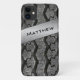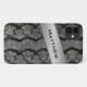 Dieses männlich schwarz und silber Gummireifen Laufflächenprofil iPhone 11 Gehäuse hat ein IMITAT metallisches silber Look Band mit Vorlagentext für Sie, um Ihre Monogramm, Initialen, Namen oder anderen Text hinzuzufügen. Wenn Sie Hilfe benötigen, senden Sie eine E-Mail an niteowlstudio@gmail.com.