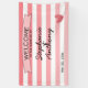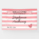 Personalisiertes Rosa mit weiß gestreiften Lieben Hochzeitsempfang. Die Einrichtung besteht aus einem Ober-Rosa mit weißem gestreiften Muster, den Namen der Braut und des Bräutigams, dem Datum, dem rosa Herz und dem Text "Willkommen".