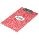 Hübsches rotes und weißes Paisley-Druckklemmbrett mit einem weißen Fahnenbereich, den Sie mit Ihrem Namen oder Initialen leicht besonders anfertigen können.