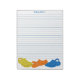 Dieses ausgekleidete Schreibpapier ist bereit, oben mit einem Namen in hellblauer Schrift personalisiert zu werden. Es hat passende blaue Linien mit einer Abbildung am Ende von drei Plastikmoccasin- oder Lack-Schuhen in Gelb, Orange und Blau.