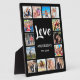 Erstellen Sie Ihre eigene personalisierte 14-Foto-Collage, Plakette mit Ihren individuellen Bildern auf einem einfachen, modernen schwarzen Hintergrund. Die Plakatwand enthält auch Ihren Familiennamen, das etablierte Jahr und eine handgeschriebene "Liebe"-Schrift. Fügen Sie Ihre Lieblings-Fotos, Designs oder Kunstwerke, um etwas wirklich Einzigartiges zu schaffen.