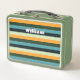 Eine auffällige, metallische Lunchbox mit fett gestreiften Mustern sowohl vorne als auch hinten. Personalisieren Sie den Namen des Empfängers auf der einen Seite, zunächst als Monogramm auf der anderen, in fett gedruckter Schrift. Ein stilvolles Accessoire für Arbeit, Schule, Reisen und Ausflüge.
