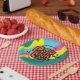Super Groovy Pot Glück Dinner Party oder andere Brunch-Teller mit einem fetten "Topf Glück Party" Text und personalisiert mit Ihrer Wahl der Farbe, und Text auf der oberen und unteren Ebene.