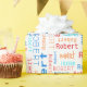 Diese anpassbare Geschenkpackung zeigt einen personalisierten Namen in einem lebhaften, farbenfrohen Design. Perfekt für Geburtstage oder besondere Anlässe, es ist ein einzigartiges Verpackungspapier für Groß und Klein. © Wafa Y. Dahdal - Alle Rechte vorbehalten.