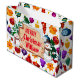 A Festive And Colorful Large Christmas Gift Bag Designed In Ornaments And Snowmen Just Add Name