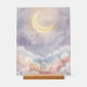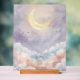 Add a modern touch of serenity to your baby’s room with this custom acrylic nursery sign. The artwork features a luminous crescent moon surrounded by whimsical clouds in pastel purple, pink, and blue, softly blended with shimmering golden stars.
